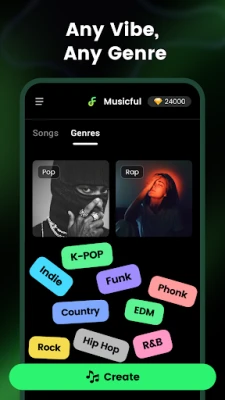 Whether you’re into Rap, Rock, Pop, Country, Auto-Tune, Jazz, Lo-fi, Acapella, or Beats, Musicful helps you create songs in your favorite style.