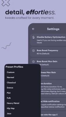 A sleek interface with easy equalizer controls, bass boost sliders, and volume boost settings. Optimized with Material Design for effortless adjustments! The intuitive UI makes managing equalizer, bass boost, and volume boost seamless. Supporting dynamic theme for Material You lovers!