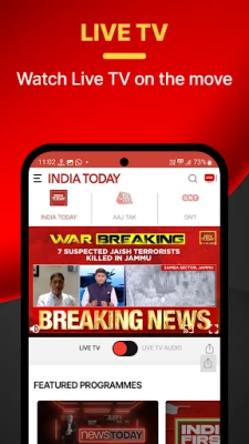 Live TV & Audio News: Watch India Today Live anytime, anywhere, absolutely free. Stream live news from Aaj Tak and Good News Today channels seamlessly. Prefer listening on the go? Switch to audio mode and stay updated with live news without needing to stream video.