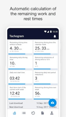 Tachogram automatically calculates remaining working time taking into account all aspects of EC regulations. Follow your remaining driving time, daily and weekly rest times.