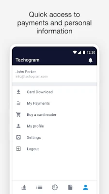 With Tachogram mobile application you can eliminate the need of visiting gas stations just to download your card data. Now you can download your tachograph driver card data anywhere - using a standard smart card reader and Tachogram application.