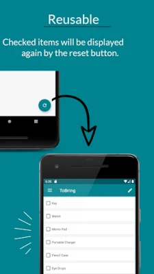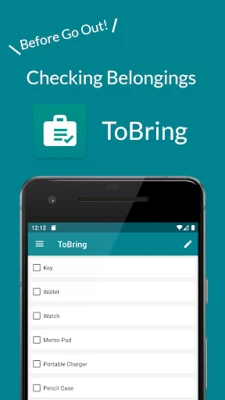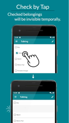App features ・ Simple UI: Just check your belongings with a tap. ・ Reusable: List can be restored with one tap. ・ High visibility: Checked belongings disappear from the screen temporarily, so you can see what you have not prepared at a glance.